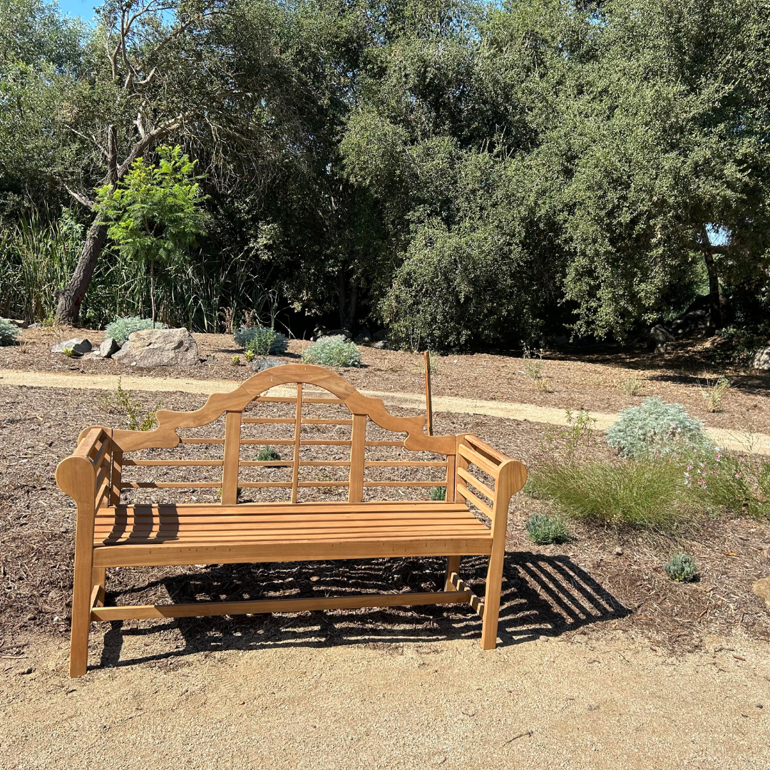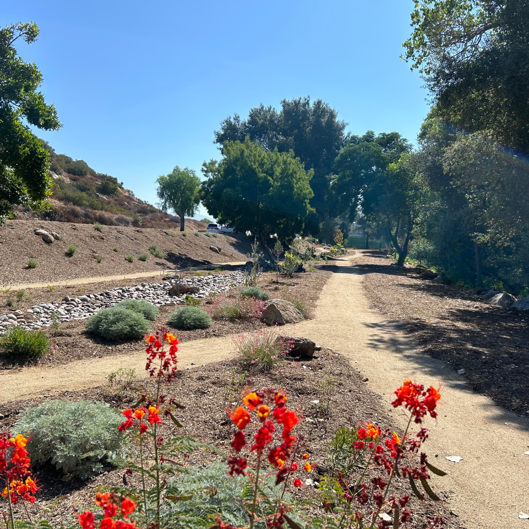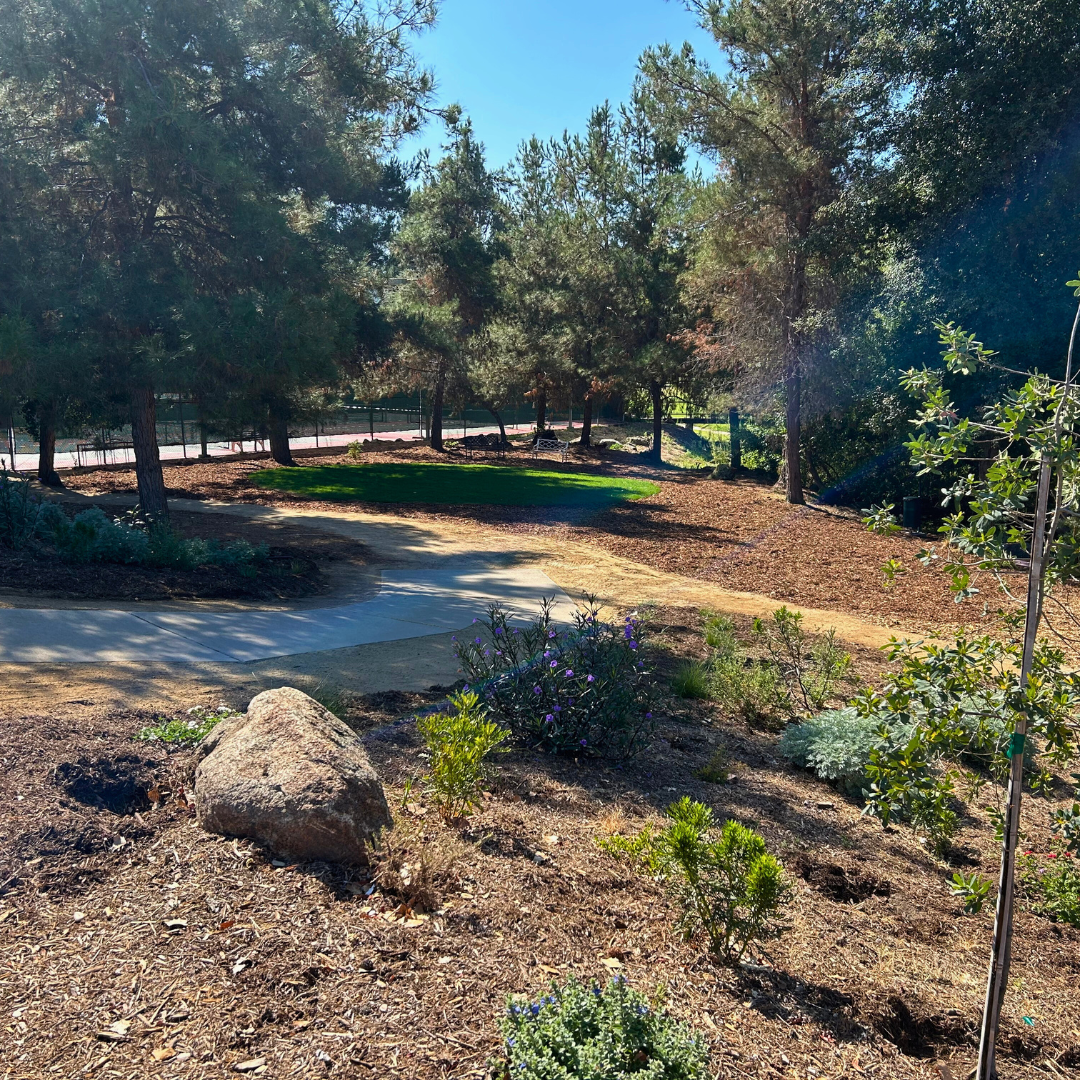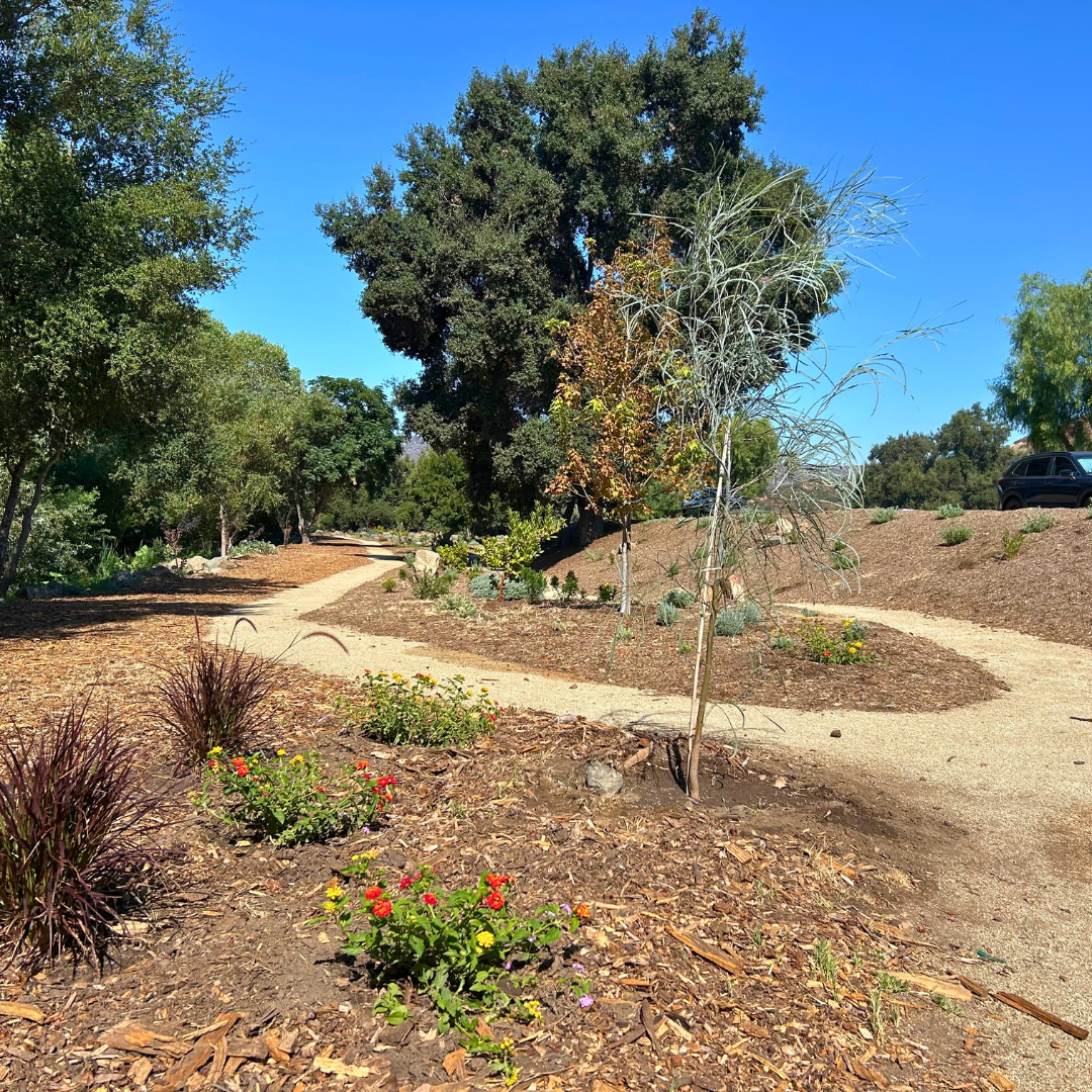 The grassy area just west of the tennis courts was transformed into a park-like design with native and drought-tolerant plants. Walking paths, benches, a dry creek bed, and a boulder bridge create an area of serenity in nature. I’ve been sharing the details of all the work on this turf reduction project, which is entirely funded by a county rebate and designed to reduce water use.