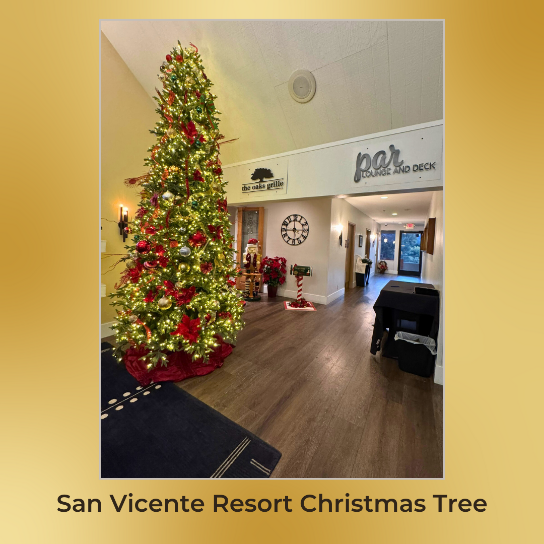 The San Vicente Resort is a magical holiday wonderland! Led by volunteers Toni Munsterman and assistants Jodie Taylor and Steve Chambers, our decorating team has created a festive atmosphere filled with music and charm. Three stunning Christmas trees grace the San Vicente Room, Par Lounge, and the lobby—the latter featuring a breathtaking, floor-to-ceiling masterpiece. Wreaths adorn all rooms, and every table at The Oaks Grille boasts a fresh poinsettia centerpiece. To celebrate Hanukkah, a silver and blue menorah is displayed in the hallway, with candles lit nightly starting December 25. Don’t forget to drop off postcards and letters to Santa in the special lobby mailbox for some magical holiday cheer!