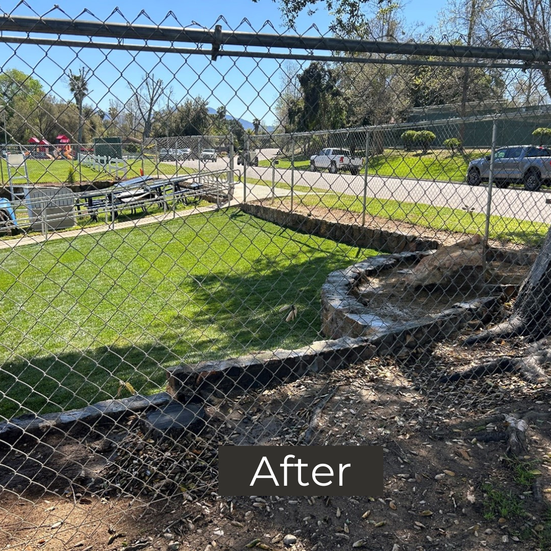 The landscape was also refreshed and simplified. Old plants were removed, and a garden was cultivated around the perimeter of the pool. The old concrete and rock area—possibly an original fountain 50 years ago but long since abandoned—was removed, and a new retaining wall around the oak tree was installed by landscape staff. Fresh sod was added for a larger seating area on the grass. Planting includes native grasses, abelia shrubs and gazanias for a pop of color.