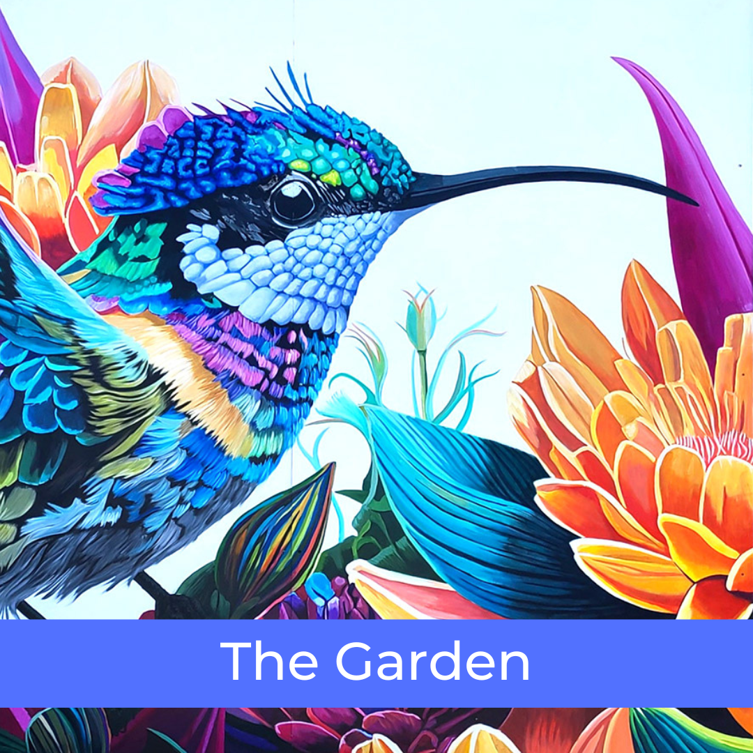 “The Garden” is Martinez’ second mural for the H.E.A.R.T. project. The multi-dimensional image is located in a small but highly visible area in the center of town at Main Street Coffee at 680 Main Street. The joyfully vibrant mural consists of two adjacent panels featuring two garden visitors.